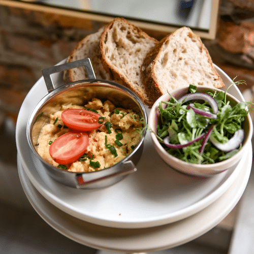 przekładana jajecznica z dwóch jaj, szczypiorek, aksamitny ser kozi z truflą, pomidorki przypieczone grzanka z rzemieślniczego chleba na zakwasie