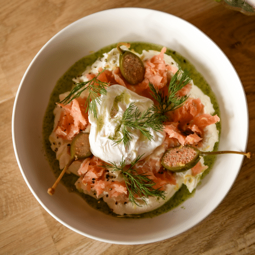 serek wiejski, puszysty twaróg, wędzony łosoś, jajko w koszulce, oliwa szczypiorkowa koperek, kapary, cytryna
